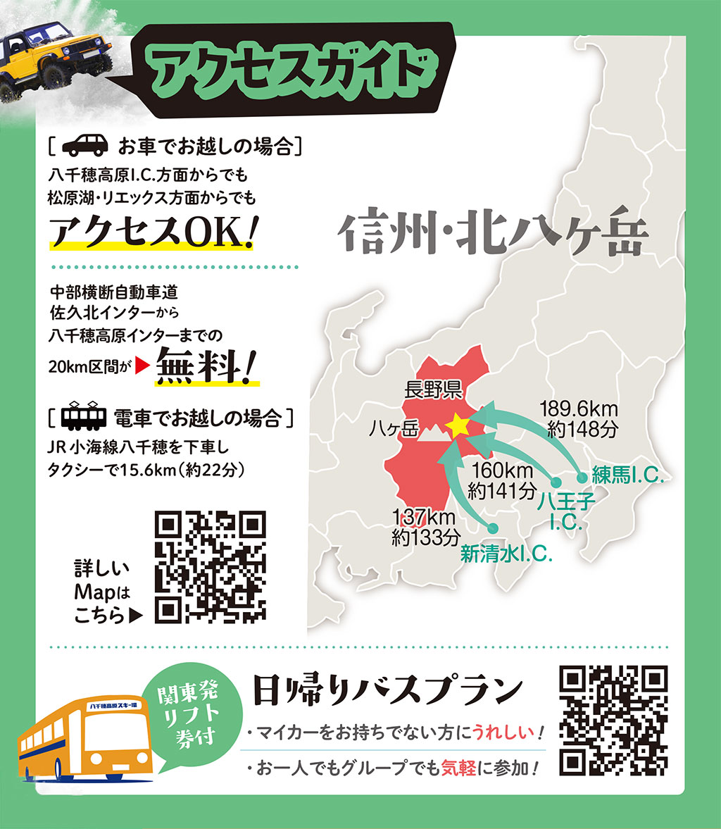 | 中央自動車道 長坂ICより 約45.7㎞ 約55分) 中部横断自動車道 八千穂高原ICより 約13.6㎞ 約17分) |